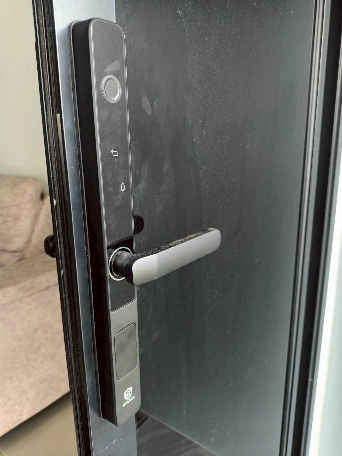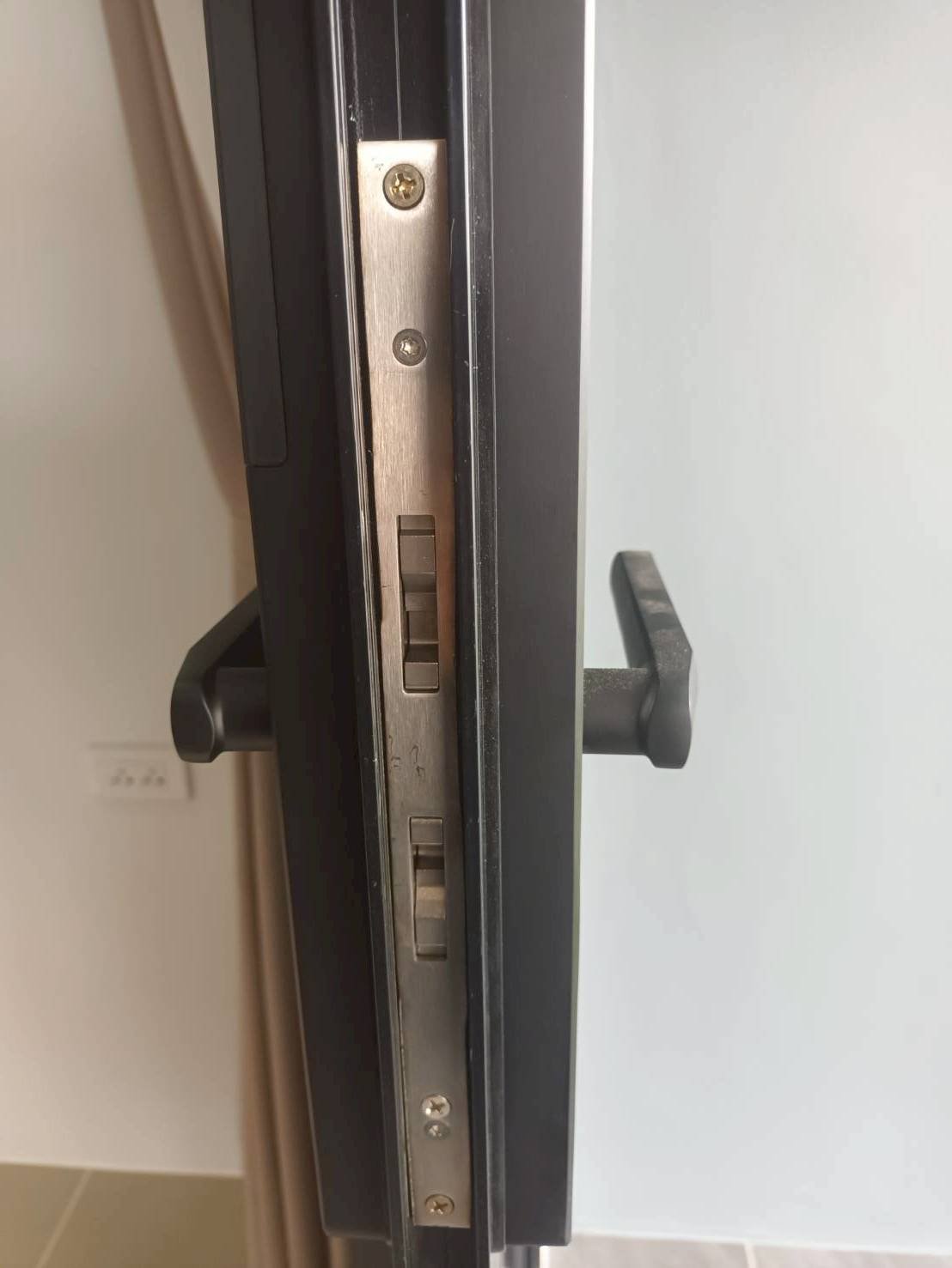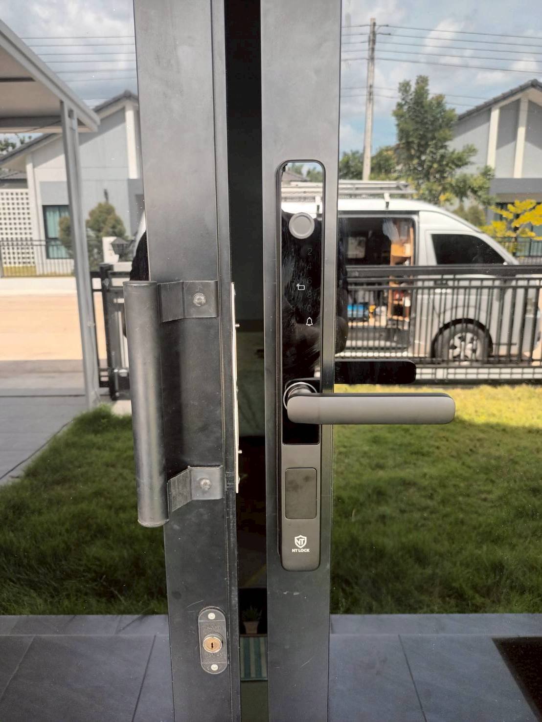 ประตูบ้านโครงการบ้านอยู่ดี 2 ประตูกระจก เฟรมมีเนียม บานเลื่อนชนกลาง กับกลอนประตูดิจิตอล รุ่น K271 สีดำ