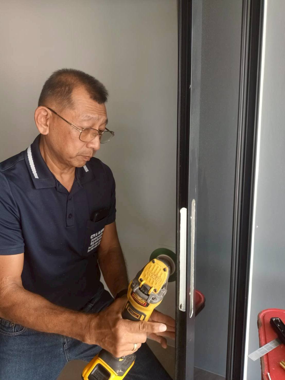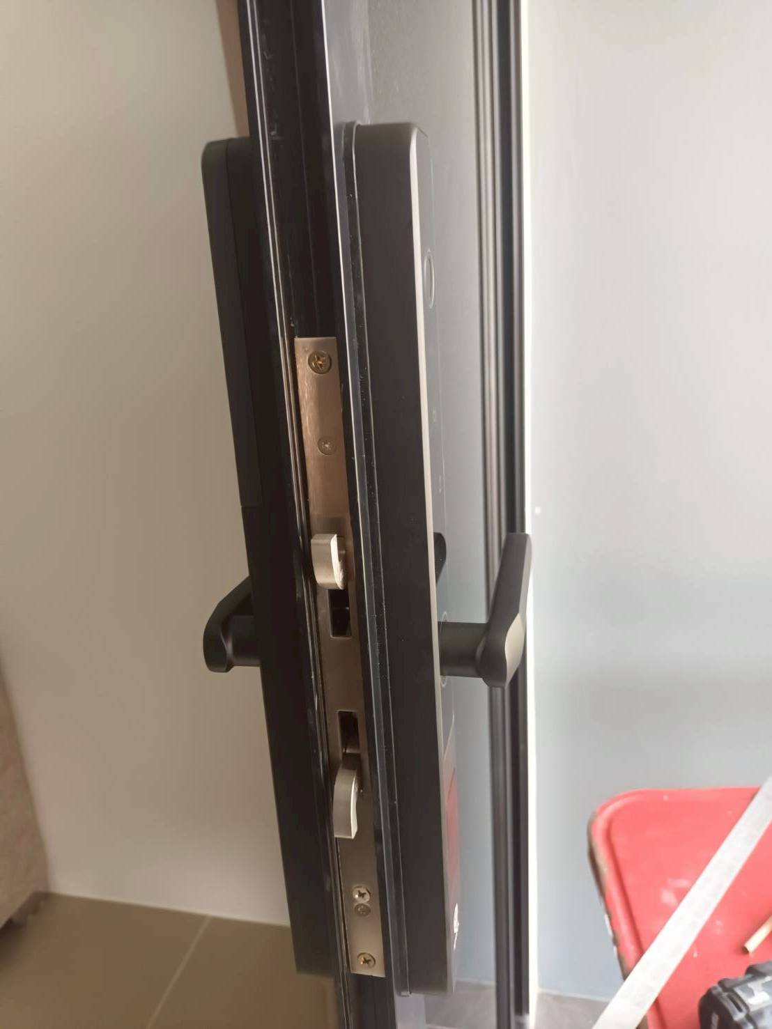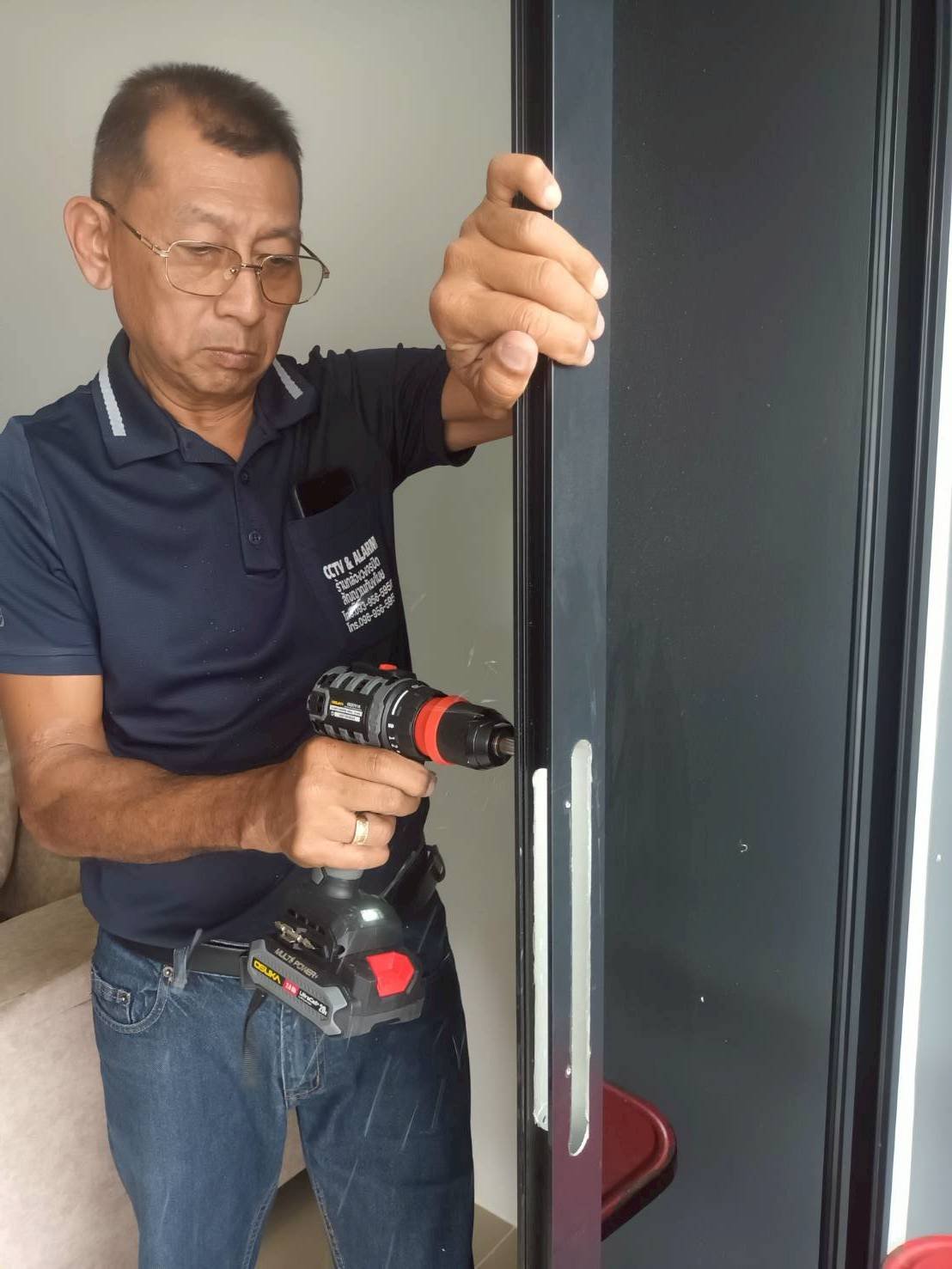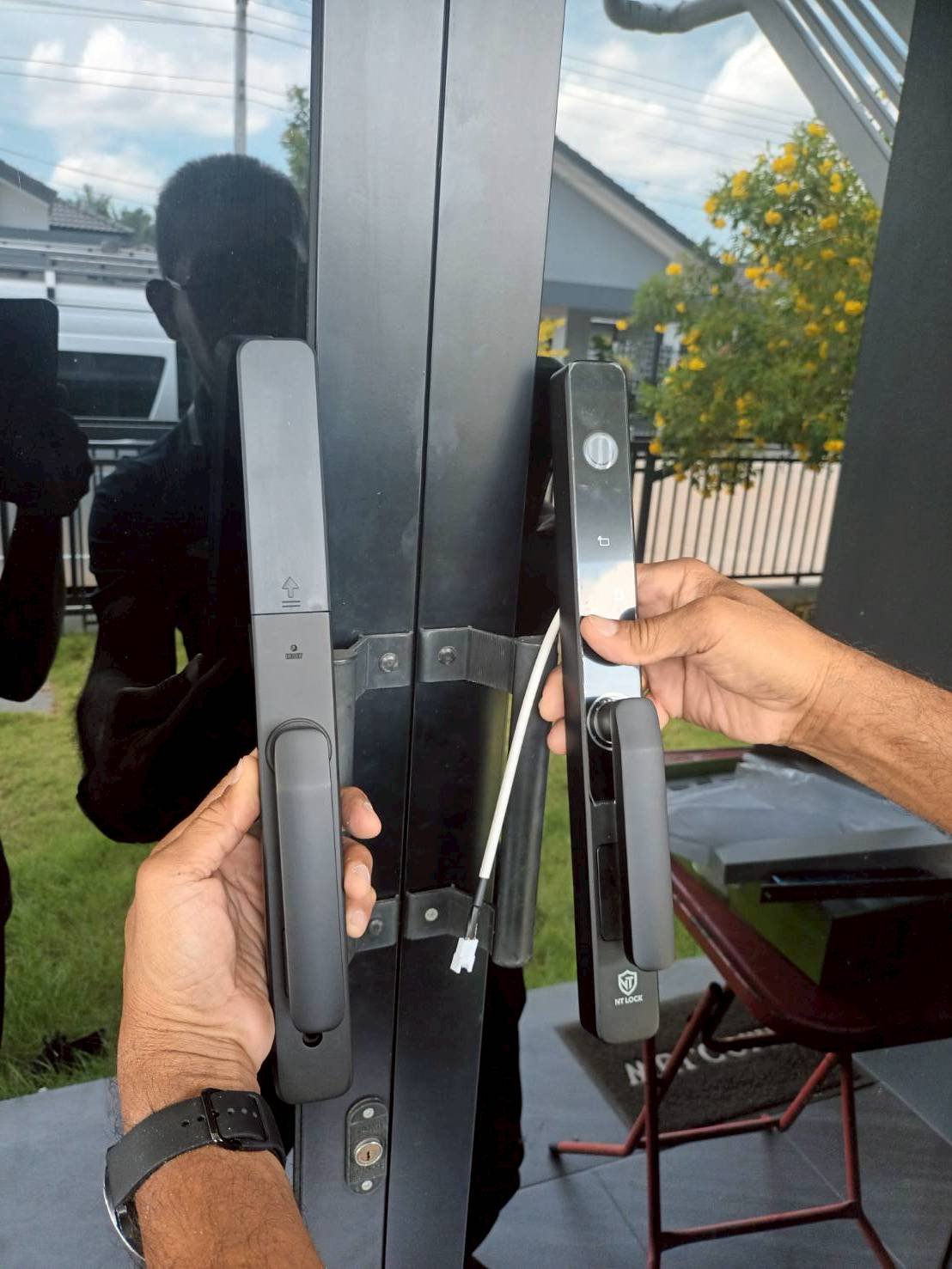 ประตูบ้านโครงการบ้านอยู่ดี 2 ประตูกระจก เฟรมมีเนียม บานเลื่อนชนกลาง กับกลอนประตูดิจิตอล รุ่น K271 สีดำ