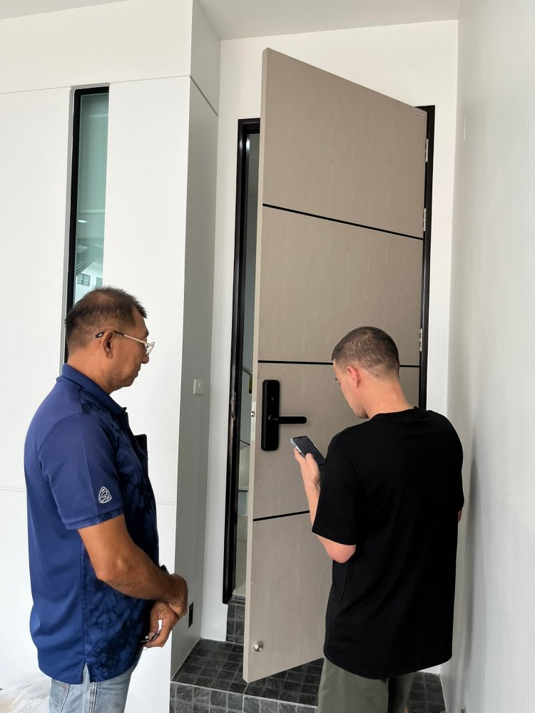 ประตูบานไม้ โครงการรินทองเซ็นทรัล 2 + กลอนประตูดิจิตอลสีดำ รุ่น JD322T เรียบหรูดูดี ฟังก์ชั่นครบ
