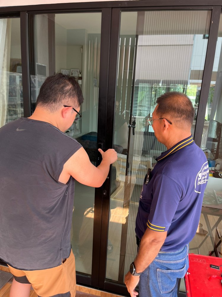 การติดตั้งกลอนประตูดิจิตอล โครงการสุขสมบูรณ์ปทุมพร แบบบานเลื่อน ชนกลาง ประตูมีเนียม ด้านในมีมุ้งลวด