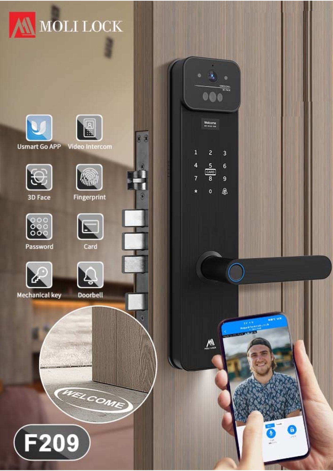 Digtial Door Lock กลอนประตูดิจิตอล ปี2026 รุ่น F209 WiFi Facescan ปลดล็อคทางไกล